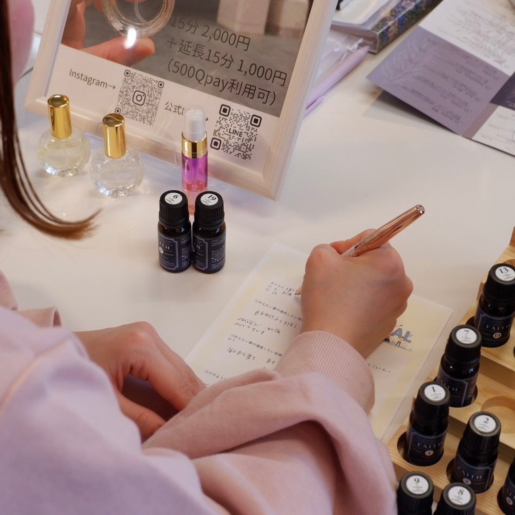 望む未来を阻む『感情整理』をワークを通して行い、選んでいただいたアロマでアロマ香水を作りお渡しします。